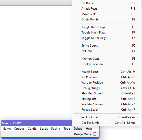 The game’s menu contains options for debugging, but has no apparent method to re-enable it and is disabled when booting the game.