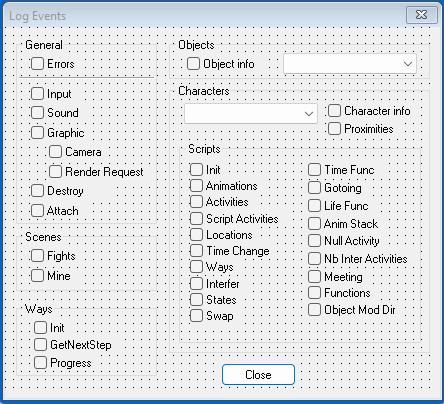 Inside of the executable are a few remnants of debugging features. The most notable is Dialog 214, which is in English only and would allow developers to trace individual events from within the game.